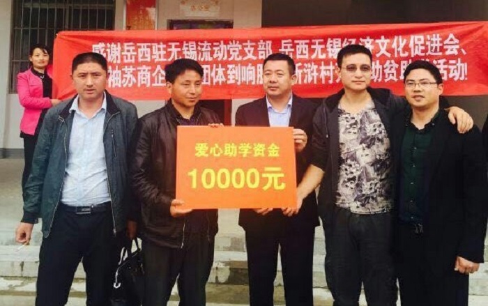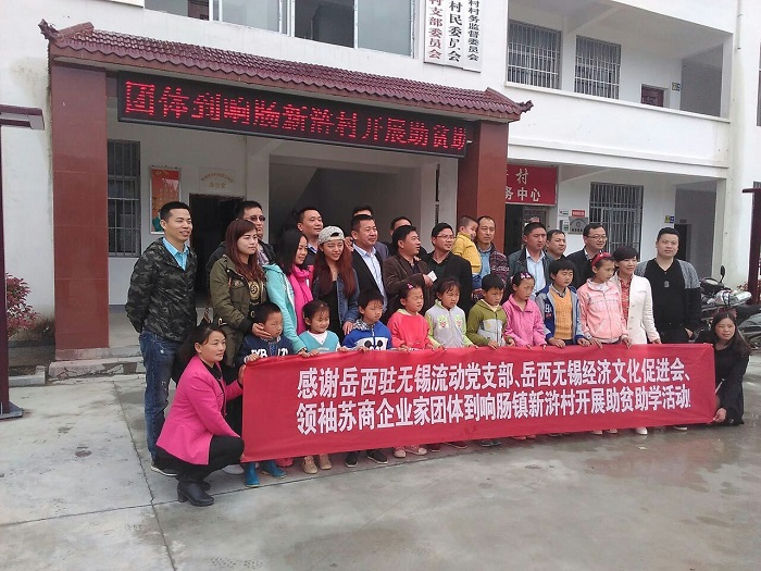 2016423日下午,無錫岳西經濟文化促進會會長、無錫勝維股份有限公司總經理胡楊生組織岳西駐無錫流動黨支部副書記胡田廣、北大匯豐商學院周家福、馬堅等企業家辛苦奔波,舟車勞頓,來到響腸鎮新滸村開展扶貧助學活動。響腸鎮副鎮長嚴高升全程陪同。