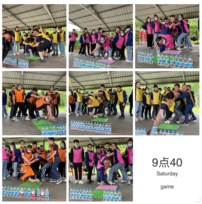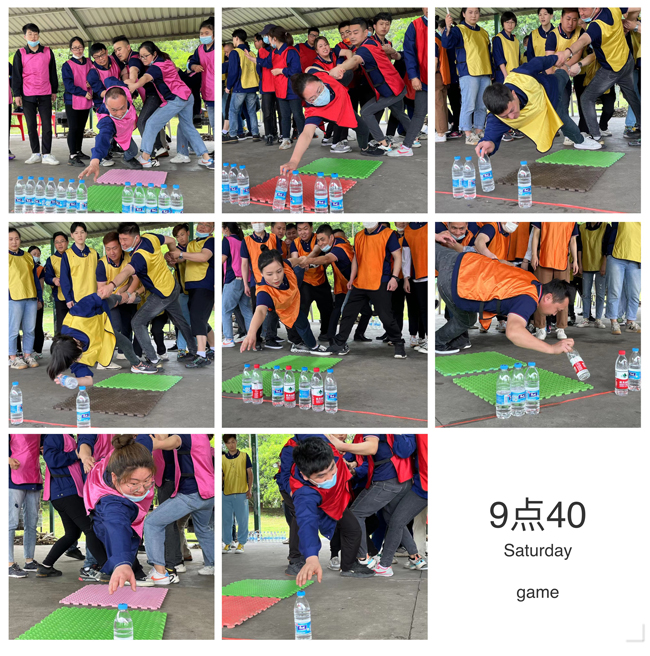 這個游戲的規(guī)則是每個隊一個圓圈,每個隊員都要穿過這個圓圈,看那個隊用時最短,每個隊都奮力爭先。眾人齊心協(xié)力,心向一處靠,力往一處使。團(tuán)隊協(xié)作精神體現(xiàn)的淋漓盡致。